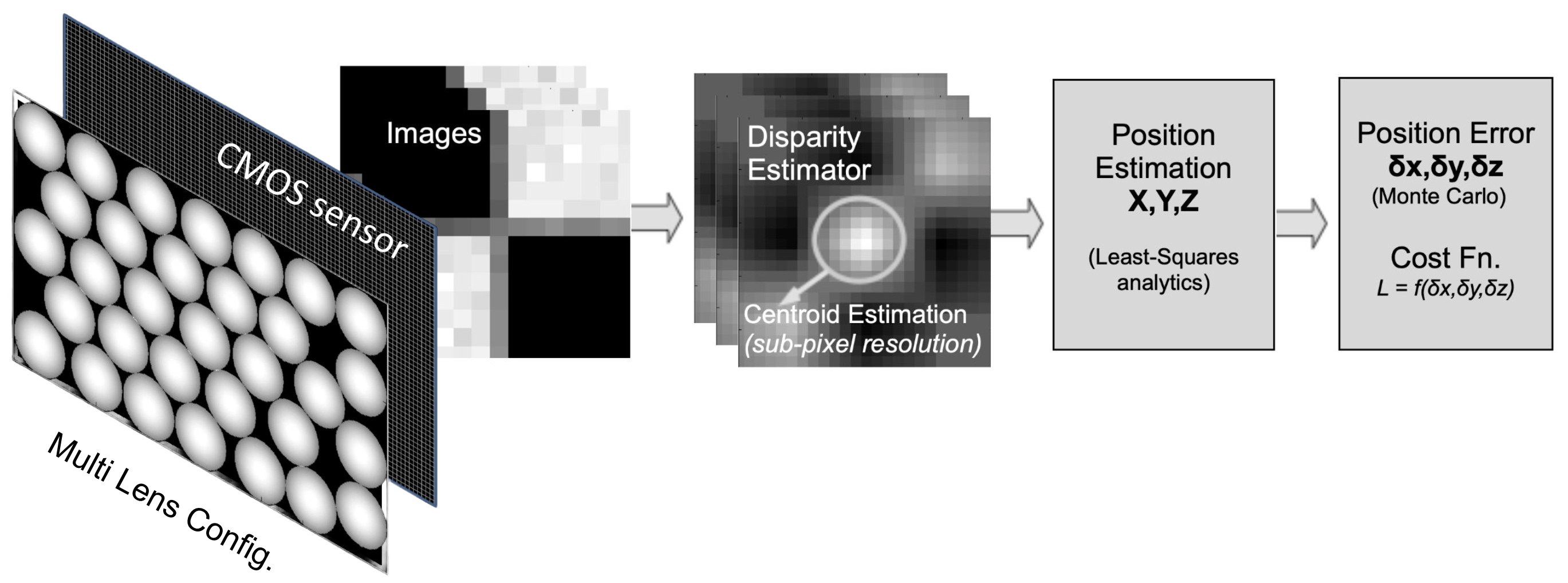 Standard 3D imagers exhibit a tradeoff between device size and position accuracy. We design compact and accurate multi view imagers by optimizing subsystem parameters using a multi view simulator. We find high accuracy multi view configurations that minimize a quality metric based on position uncertainties estimated using a closed form analytical solution and a Monte Carlo simulation. COSI 11, US9245445B2, COSI 13, US9851475B2.